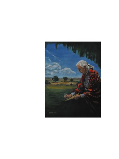 I had the priviage of attending a Jane Goodall speaking event In early 2011 and was intrigued by her colorful cape. Afterwards, she allowed me to photorgaph her while she met with fans. In my studio, I supplied an African landscape (from www.dreamstime.com) and created this imaginary moment of solitude in the wilderness (pehaps while she was taking notes). Ironically, at the time of the photo, she was actually surrounded by people and signing a little girl's poster, but Jane's focus was so absolute she could have just as well been alone at that instant.